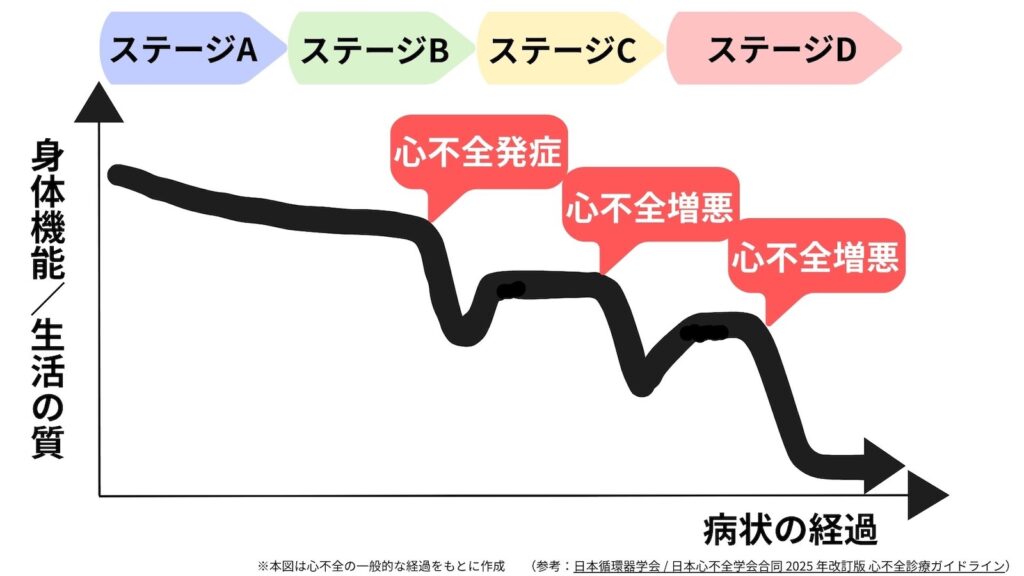 そして、心不全増悪を繰り返すたびに心臓にダメージが蓄積し、身体機能や生活の質が低下するとされています。
